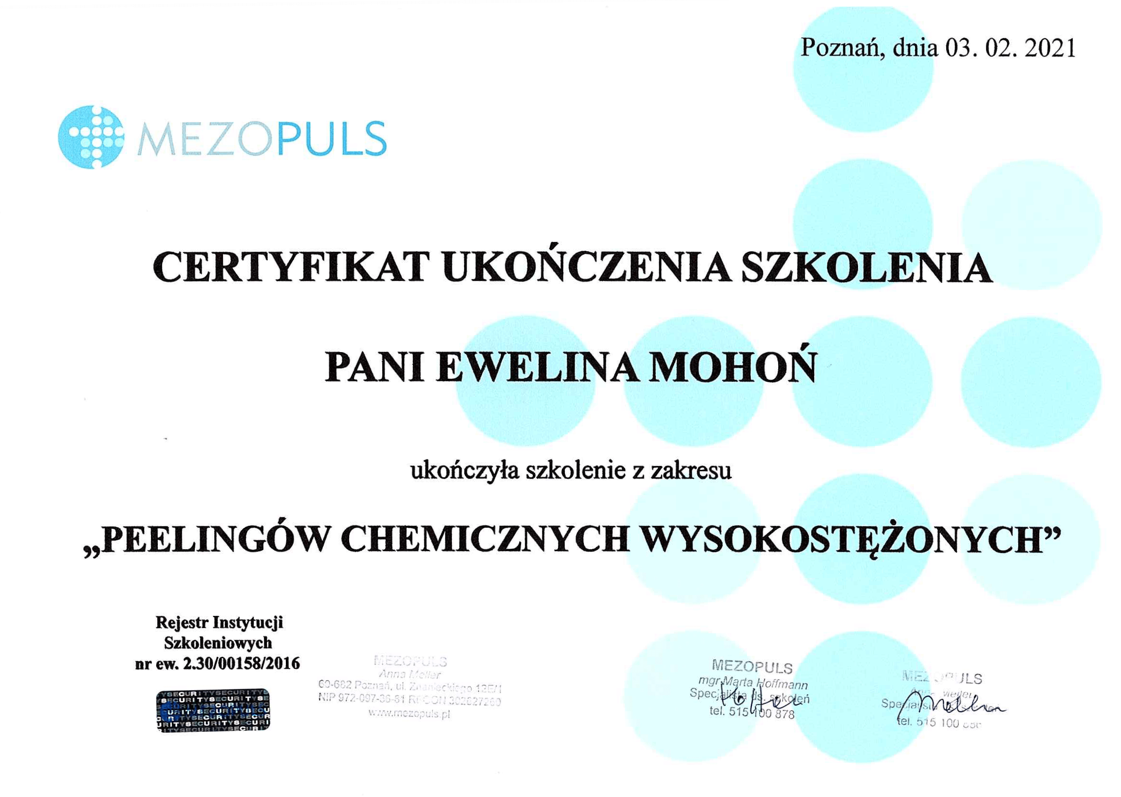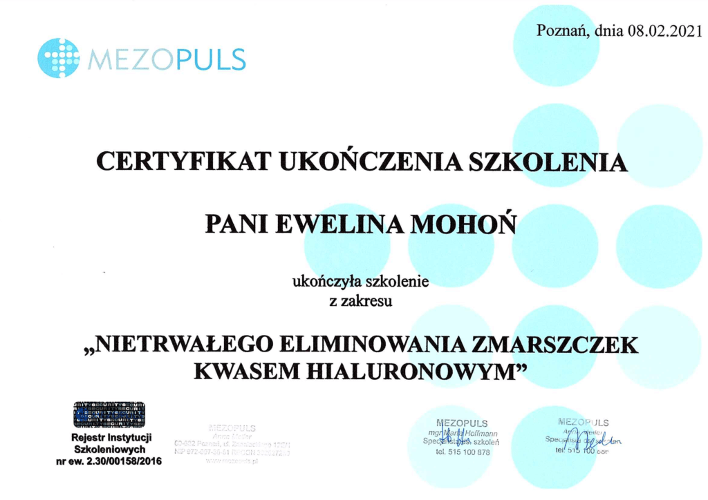 Wiedzę, którą zdobyłam i nieustanie poszerzam uczestnicząc w licznych szkoleniach z zakresu kosmetologii estetycznej oraz podnosząc swoje kwalifikacje zawodowe, dają mi możliwość i poczucie pełnej odpowiedzialności, wykonywać zabiegi oraz dbać o zewnętrzne piękno swoich klientów.
